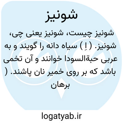 شونیز. ( اِ ) سیاه دانه را گویند و به عربی حبةالسودا خوانند و آن تخمی باشد که بر روی خمیر نان پاشند. ( برهان ). مرادف شنیز و شونیز معرب آن. ( رشیدی ). سیه دانه. ( دهار ). حبةالسوداء. ( قاموس ). تخمی است سیاه که به هندی کلونجی گویند. ( غیاث اللغات ). سیاه دانه. حبةالسودا و آن تخمی است که بر روی نان پاشند. ( از آنندراج ) ( از انجمن آرا ). لغتی در شنیز.( منتهی الارب ). سیاه تخمه. نان خواه. شنیز. سویداء. بوغنج. شونوز. شینیز. شهنیز. حبةالمبارکة. و بنا بر قول دینوری اصل کلمه فارسی است. ( یادداشت مؤلف ). بزغنج. ( نزهةالقلوب ). شنبیذ. شویز. شونانا. کالنجی. قالیز. سیاهدانه. ( از ترجمه صیدنه بیرونی ). شنیز است وحب السوداء گویند و به پارسی شونیز و شنیز گویند. ( از اختیارات بدیعی ). شونز. شنز. شینیز. سنیز. معرب آن شؤنیز. شونیز یا سیاه دانه از تیره آلاله ها و شماره گلبرگهای آن از پنج تا هشت است و دانه های سیاه رنگ آن در برگه های وسط گل قرار گرفته و بوی مخصوصی دارد.( حاشیه برهان چ معین از گل گلاب ص 200 ):