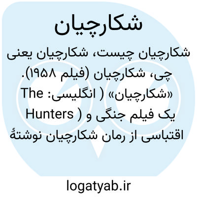 شکارچیان (فیلم ۱۹۵۸). «شکارچیان» ( انگلیسی: The Hunters ) یک فیلم جنگی و اقتباسی از رمان شکارچیان نوشتهٔ جیمز سالتر است. فیلم به کارگردانی دیک پاول است که در سال ۱۹۵۸ منتشر شد. رابرت میچام، و رابرت واگنر در نقش دو خلبان جنگنده نیروی هوایی ایالات متحده آمریکا در طول جنگ کره در آن به ایفای نقش می پردازند.