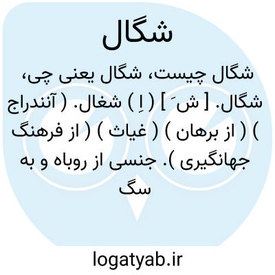 شگال. [ ش َ ] ( اِ ) شغال. ( آنندراج ) ( از برهان ) ( غیاث ) ( از فرهنگ جهانگیری ). جنسی از روباه و به سگ ماند و سرخ گون باشد و موی او نیز با موی روباه بیامیزند. ( لغت فرس اسدی ). شغا: