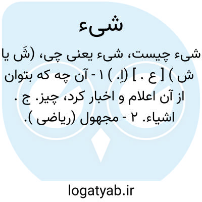 (شَ یا ش ) [ ع. ] (اِ. ) ۱ - آن چه که بتوان از آن اعلام و اخبار کرد، چیز. ج. اشیاء. ۲ - مجهول (ریاضی ).
