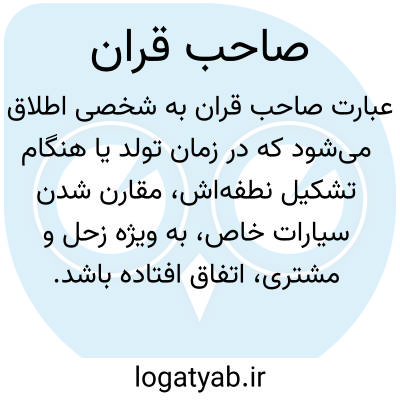 صاحب القران: نیک طالع، خوش اقبال، کسی که در هنگام نطفه بستن یا به دنیا آمدنش، سیاراتی در قِران بوده باشند.