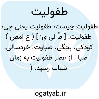 طفولیت. [ طُ لی ی َ ] ( ع اِمص ) کودکی. بچگی. صباوت. خردسالی. صبا: از عصر طفولیت به زمان شباب رسید. ( ترجمه تاریخ یمینی ص 397 ). او در سن طفولیت... موسم ضعف رای و نقصان رشد بود. ( ترجمه تاریخ یمینی ص 205 ). یاد دارم که در ایام طفولیت متعبد بودمی و شبخیز. ( گلستان ).