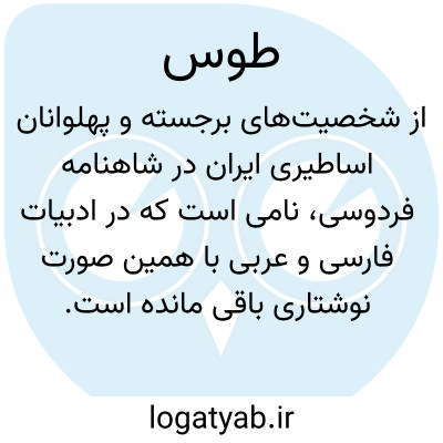 طوس (شاهنامه). (یا: توس) در شاهنامۀ فردوسی، پسر نوذَر، پهلوان و سپهسالار ایران. چون نوذَر از افراسیاب شکست خورد، پسران خود طوس و گُستَهَم را به ایران فرستاد؛ اما آنان در میان راه بودند که از کشته شدن پدر آگاه شدند و بی درنگ، برای گرفتن کمک از زال، روی به زابلستان نهادند. زال به آنان کمک رساند، اما به سبب همراه نبودن فَرّ کیانی با طوس و گستهم، با پادشاهی طوس مخالفت کرد. طوس، با این که سرداری عجول بود و خرد ممتازی نداشت، در میان پهلوانان ایران محبوب بود و همواره سپهسالاری سپاه ایران را داشت. با این همه، از او در دورۀ پادشاهی زو، گَرشاسپ و کِیقُباد خبری نیست و دوباره در زمان کِیکاوس است که از پهلوانان نامدار می شود. او با رفتن کِیکاوس به مازندران مخالف بود اما سرانجام ناگزیر از همراهی او شد. در این جا طوس با کِیکاوس به زندان دیو سپید افتاد، که رستم نجاتشان داد. در نبرد هاماوَران نیز که کِیکاوس به بند افتاد و رستم نجاتش داد، طوس همراه شاه بود. طوس به فرمان کِیکاوس به جنگ سهراب رفت، اما ناچار از گریختن شد. با بر تخت نشستن کِیخُسرو، طوس از رفتن به نزد او سرباز زد و چنین به رخ کشید که او نبیرۀ منوچهر است و پس از رستم کسی سرفرازتر از او نیست. اما طوس سرانجام به کِیخُسرو پیوست و عهده دار نگهداری از دِرَفش کاویانی شد. شاه او را به فرماندهی سپاه ایران به جنگ با تورانیان فرستاد و از او خواست، چون برادرش فرود در کَلات است، از راه کلات به توران نرود؛ اما طوس راه کلات را برگزید و در آن جا، بیژن فرود را کشت و راه توران را پیش کشید، اما از پیران شکست خورد و به عقب نشست. کیخسرو، با شنیدن خبر کشته شدن برادرش، طوس را عزل کرد و فریبرز را بر جای او نشاند و او را به بند کشید. سرانجام رستم نزد کیخسرو شفاعت کرد و باری دیگر او را به سپهسالاری ایران رساند. طوس در نبرد بعدی خود با پیران در توران ارژنگ را کشت. کیخسرو هنگام ناپدیدشدن، طوس را سپهدار ایران کرد و درفش کاویانی و فرمانروایی خراسان را به او داد. اما طوس نیز در بدرقۀ کِیخسرو غایب شد و هرگز بازنگشت. طوس در باور زردشتیان از جاودانان است.