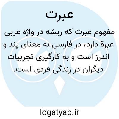 ۱ - ( مصدر ) پند گرفتن. ۲ - ( مصدر ) مقیاس گرفتن سنجیدن. ۳ - ( اسم ) نوع قسم. ۴ - پند. ۵ - محصولاتی که از کشتی نشینان چادر نشینان یا به جهت راهداری می گرفتند. ۶ - خراج باج. ۷ - ( صفت ) آن چه که مورد عبرت گرفتن شود موجب عبرت. ۸ - شگفت. یا عبرت شش روزه. ۱ - آسمان و زمین و آنچه در میان آنهاست از مخلوقات. ۲ - آنچه که از ما بفعل آورده شود. یا عبرت دیگران گردانیدن. کسی را سخت تنبیه کردن تا دیگران پند گیرند. یا موجب عبرت شدن. بسبب مصایب و بدبختی هایی که نتیجه اعمال شخص است موجب پند گرفتن دیگران شدن.