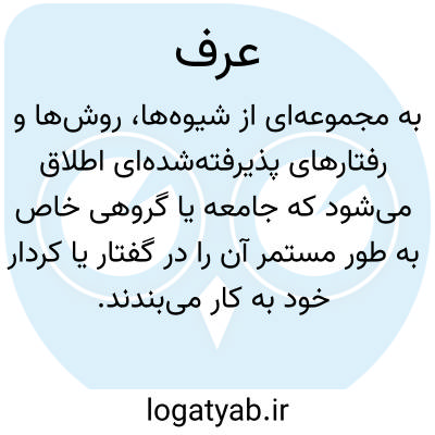 [ویکی فقه] ـــ عُرف، شیوه متعارف و پذیرفته شده نزد همه یا گروهی از مردم می باشد. ـــ شیوه مستمر میان همه یا بیشتر مردم یا گروه خاص را عرف گویند.