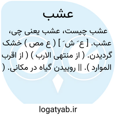 عشب. [ ع َ ش َ ] ( ع مص ) خشک گردیدن. ( از منتهی الارب ) ( از اقرب الموارد ). || روییدن گیاه در مکانی. ( از اقرب الموارد ).