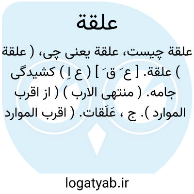 (عُ لْ قَ ) [ ع. علقة ] (اِ. ) ۱ - عشق، دلبستگی. ۲ - گرانمایه از هر چیزی.۳ - آن مقدار از علوفه که غذای یک روزة شتر باشد.