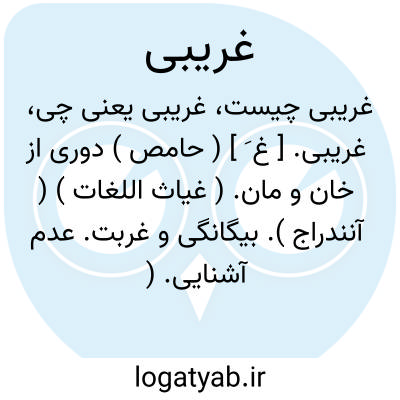 غریبی بود عذرخواهی بزرگ.نظامی ( از امثال و حکم دهخدا ). غریبی خاک دامن گیر دارد.؟ ( امثال و حکم دهخدا ).|| بینوایی و گدایی و افلاس. ( ناظم الاطباء ). || فروتنی. ( ناظم الاطباء ). || ( اِ ) قماشی است بسیار نفیس. ( غیاث اللغات ) ( آنندراج ). || ( ص ) به معنی غریب. ( لسان العرب از ذیل اقرب الموارد ).