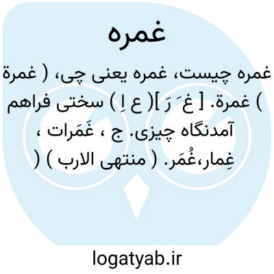 ( غمرة ) غمرة. [ غ َ رَ ]( ع اِ ) سختی فراهم آمدنگاه چیزی. ج، غَمَرات، غِمار،غُمَر. ( منتهی الارب ) ( آنندراج ). سختی. ( ترجمان علامه جرجانی ). دشواری. ( دهار ). سرگردانی و سختی. ( مهذب الاسماء ): غمرةالشی ٔ؛ شدته و مزدحمه. ( از اقرب الموارد ). تنگی و شدت. سختی مرگ. هر سختی که باشد. || انبوهی مردم. || گروه مردم پراکنده از هر جای. || بسیاری آب. ج، غِمار. ( منتهی الارب ) ( آنندراج ). آب بسیار. ( ذیل اقرب الموارد ). || گرداب. ( مهذب الاسماء ) ( تفسیر ابوالفتوح رازی ). || مجازاً بمعنی انهماک در باطل. ( ناظم الاطباء ). غفلت و جهل و حیرت و ضلالت. ( تفسیر ابوالفتوح رازی ): فذرهم فی غمرتهم حتی حین. ( قرآن 54/23 ). || غمرة الموت؛ سختی مرگ.