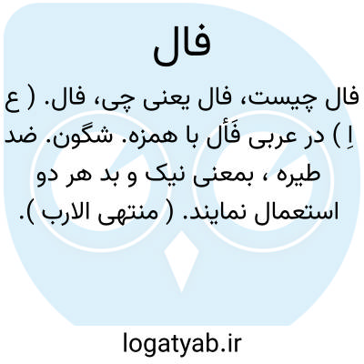 فال. ( ع اِ ) در عربی فَأل با همزه. شگون. ضد طیره، بمعنی نیک و بد هر دو استعمال نمایند. ( منتهی الارب ). اغور. آغال. شگون. ( ناظم الاطباء ):