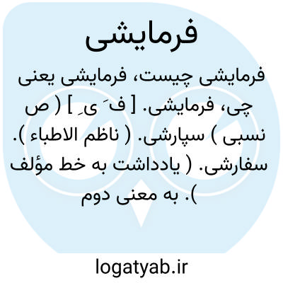فرمایشی. [ ف َ ی ِ ] ( ص نسبی ) سپارشی. ( ناظم الاطباء ). سفارشی. ( یادداشت به خط مؤلف ). به معنی دوم فرموده که بیاید. ( آنندراج ). || هر چیز اعلا و نفیس. ( ناظم الاطباء ).