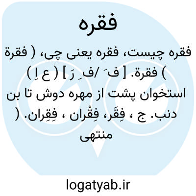 ۱ - هر یک از بندهای ستون فقرات مهره پشت. یا فقره ثانی عنق. آسه یی ۲ - یک جمله ( یا عبارت ) جمع: فقر فقرات. توضیح فقره که معمولا ( در تداول فارسی ) بفتح فائ و قاف تلفظ می شود در اصل فقره بکسر فائ و سکون قاف است و فقرهبفتح فائ و سکون فائ و سکون قاف است و فقره به دو فتح بجز اقیانوس و معیار اللغه در هیچیک از منابعی که در دسترس است دیده نمی شود. صاحب اقیانوس فقره به فتح فائ را بر خلاف نص صاحب قاموس اشتباها بفتحین ضبط کردن و مولف معیار اللغه نیز گویا از او پیروی کرده است.