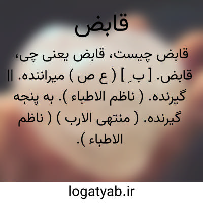 ( اسم ) ۱ - گیرنده در مشت گیرنده ۲ - در آورنده بیرون کشنده: قابض روح ۳- میراننده ۴- نامی از نامهای خدای تعالی ۵ - دریافت کننده محصل مالیات دیوانی: تو فضولی یا قابض ۶ ? - هر چیز که طبع را در هم کشد و ترنجید کند آنچه که طبع را یبوست طبع آورد و مزاج را خشک کند گس دبش عفص ۷ - دارویی که جهت قبض روده و جلوگیری از اسهال استعمال می شده ادویه عفصه. یا قابض ارواح. گیرنده جانها ملک الموت عزرائیل. یا قابض جریمه. کسی که تاوان و جریمه در نزد وی جمع شود. یا قابض مالیات. آنکه مالیات در نزد وی جمع گردد.