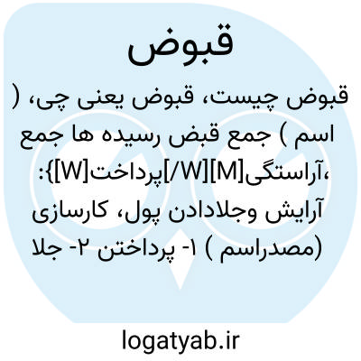 ( اسم ) جمع قبض رسیده ها جمع:{[W]پرداخت[/W][M]آراستگی، آرایش وجلادادن پول، کارسازی
