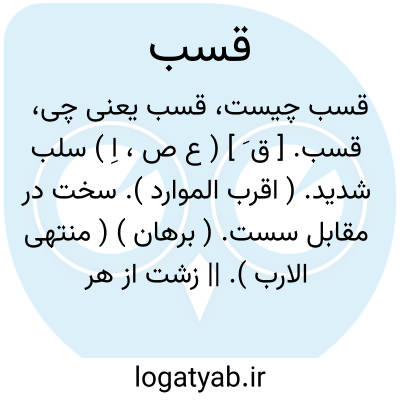 قسب. [ ق َ ] ( ع ص، اِ ) سلب شدید. ( اقرب الموارد ). سخت در مقابل سست. ( برهان ) ( منتهی الارب ). || زشت از هر چیزی. ( منتهی الارب ). || خرمای خشک که در دهان ریزه گردد. ( اقرب الموارد ) ( منتهی الارب ). نوعی از خرمای خشک باشد که اهل نجد آن را برشوم خوانند. گویند قابض است و شکم ببندد. ( برهان ). تمر نخل خشک شده و نیمرس آن،و اهل مغرب آن را مقلقل و اهل نجد عرع و برشوم و به فارسی خرمای سنگ شکن و به شیرازی قسبک نامند و اقسامی دارد، آنچه را بعد از جوش دادن در آب شکافته و پارچه غیرمتساوی نموده و خشک کرده باشند شکم دریده نامند و آنچه سر آن را بلبل خورده و در درخت مانده خشک شده باشد بلبل خورده گویند و این شیرین تر میباشد، و بهترین همه بزرگ فربه هسته کوچک آن است که خشک باشد. طبیعت آن گرم و خشک و افعال و خواص آن مقوی معده و ناشف رطوبات و مستحکم کننده الیاف آن و حابس طبع و نفاخ و بطی ءالهضم و مرخّی معده و گاه اسهال می آورد و مصلح آن مغز گردکان بریان کرده، و گفته اند قسب قاطع اسهال بلغمی و مسکن عطش حادث از بلغم مالح است و بهتر آن است که خشک اندک مایل به سبزی آن را مقدار کمی بالای طعام سرد و تر بخورند خصوصاً صاحبان ضعف معده. ( مخزن الادویه ). و رجوع به تحفه حکیم مؤمن شود. || ( مص ) روان شدن. ( اقرب الموارد ) ( منتهی الارب ). شریدن آب. ( زوزنی ). قسب الماء قسباً؛ روان شد. || غروب شدن گرفتن. ( اقرب الموارد ) ( منتهی الارب ):قسب الشمس؛ سرعت و اخذت فی الغیب. ( اقرب الموارد ).