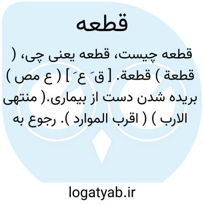 قطعة. [ ق ُ ع َ ] ( ع اِ ) جای برش. ( اقرب الموارد ) ( منتهی الارب ). || جای سپری شدن و تحرک. ( منتهی الارب ). || باقیمانده دست بریده. ( منتهی الارب ). ج، قُطَع. ( منتهی الارب ) ( اقرب الموارد ). || پاره چیزی. || پاره زمین جداکرده در بخش و بهره. ( اقرب الموارد ) ( منتهی الارب ). || میده سپید. || گندم سپید. ( اقرب الموارد ). || سبوس گندم. ( اقرب الموارد ) ( منتهی الارب ). || لثغه ای است در زبان بنی طی مانند عنعنه بنی تمیم، و آن این است که میگویند اباالحکاء و مراد آنان اباالحکم است. ( اقرب الموارد ) ( منتهی الارب ). || ( اِمص ) خشک شدگی چاه. ( اقرب الموارد ) ( منتهی الارب ).