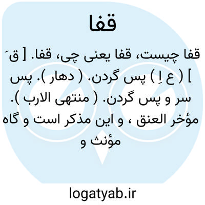 ( اسم ) ۱ - پس گردن پشت گردن: افغان و خون دیده بین صد پیرهن بدریده بین خون جگر پیچیده بین بر گردن و روی و قفا. ( دیوان کبیر ۲ ) ۸: ۱ - پشت ۳ - پی دنبال: دختر نیز در قفای دایه بیرون آمد ۴ - عقب: بانگ بردابرد گیراگیر باشد در قفا. یااز قفا با کسی آرمیدن ( مباشرت کردن ). با او از پشت جماع کردن. یا بر قفای کسی رفتن. از پی او رفتن: لالا صالح از سرای بیرون آمد در قفای سمک عیار برفت.