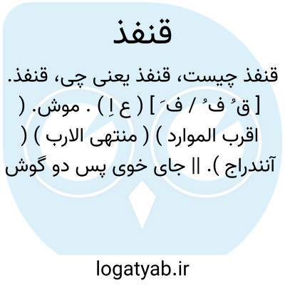 قنفذ. [ ق ُ ف ُ / ف َ ] ( ع اِ ). موش. ( اقرب الموارد ) ( منتهی الارب ) ( آنندراج ). || جای خوی پس دو گوش شتر. ( منتهی الارب ). ذفری البعیر وفی المحکم: مسیل العرق من خلف اذنی البعیر. ( اقرب الموارد ). || ریگ توده فراهم آمده بلند. || درختی که در وسط ریگ رسته باشد. ( منتهی الارب ) ( اقرب الموارد ) ( آنندراج ). || جایی که در وی گیاه درهم و انبوه روید. ( منتهی الارب ) ( اقرب الموارد ). || جوجه تیغی. خارپشت. ( منتهی الارب ) ( اقرب الموارد ) ( آنندراج ). بعضی گفته اند خارپشت ماده را قنفذه گویند و نر را شیهم یا دلدل. ( ناظم الاطباء ). ج، قنافذ. ( اقرب الموارد ) ( منتهی الارب ).