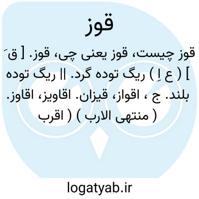 قوز. [ ق َ ] ( ع اِ ) ریگ توده گرد. || ریگ توده بلند. ج، اقواز، قیزان. اقاویز، اقاوز. ( منتهی الارب ) ( اقرب الموارد ) ( ناظم الاطباء ).