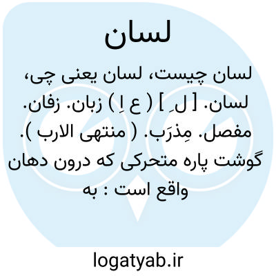 لسان. [ ل ِ ] ( ع اِ ) زبان. زفان. مفصل. مِذرَب. ( منتهی الارب ). گوشت پاره متحرکی که درون دهان واقع است:
