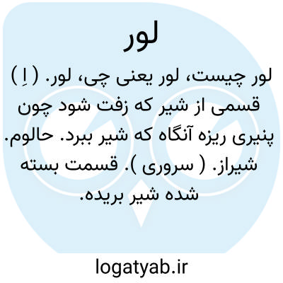 لور. ( اِ ) قسمی از شیر که زفت شود چون پنیری ریزه آنگاه که شیر ببرد. حالوم. شیراز. ( سروری ). قسمت بسته شده شیر بریده. ماده پنیری که از شیر بریده و کلچیده حاصل آید و آن غذائی ثقیل است و با شکر یا شیره خورند. محمدبن یوسف هروی در بحر الجواهر گوید: اجزاء دَسمة تختلط بلطیف الجبنیه عند انفصال ماءالجبن و ینفصل عنه بالغلیان ؟ ( بحر الجواهر ). ماده زفتی که از شیر بریده حاصل شود. شیر بسته. بریده شیر. ثُفل. ( زمخشری ). شیر بریده و آن غیر پنیر است. دَلَمه شیر. کریز. کریس. ( السامی ): و از همه شیرینیها و از لور و شیر و دوغ پرهیز کنند و طعام از غوره و سماق وزرشک و انار دانگ باید داد. ( ذخیره خوارزمشاهی ).