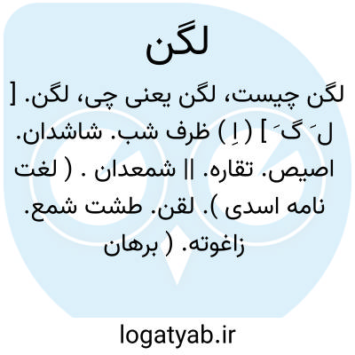 ( اسم ) ۱- تشتی فلزی که آن با دست و رخت و غیره شویند آبدستان: ز آبدست تو مانند کوثر است لگن اگر ززحمت صرف است آب در کوثر. ( معزی ۲ ) ۶۳۶- ظرف شب شاشدان ۳- شمعدان: از سرو گویم یا چمن از لاله گویم یاسمن از شمع گویم یا لگن یا رقص گل پیش پا ? ( دیوان کبیر ۴ ) ۷: ۱- عود سوز بخور سوز سپند سوز. ۵- آتشدان آهنی منقل: چهار پای به زنجیر حادثات کشان همیشه سینه بر آتش بود بسان لگن. ( سلمان ساوجی لغ ) ۶- پارچه ای که دور فانوس کشند جامه فانوس کرته فانوس: مست شد با دور آن زلف را از روی یار چون چراغ روشنی کزوی تو بر گیری لگن. ( مواوی لغ ) ۷- لگن خاصره یا لگن خاصره. حفره ای که از مفصل شدن دو استخوان خاصره و خاجی تشکیل می شود و استخوان دنبالچه که در پایین استخوان خاجی است نیز جزو استخوان های تشکیل دهنده لگن محسوب است. لگن در حقیقت قسمت تحتانی تنه است و توسط تنگه فوقانی به دو قسمت تقسیم می شود: یکی لگن بزرگ در بالا که جزو شکم استئ دیگر در خفره لگن کوچک در پایین تنگه. در حفره لگن خاصره قسمتهایی از دستگاه گوارش و دستگاه تناسلی قرار دارند لگن. یا لگن زمردی. آسمان.