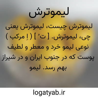 ( اسم ) گونه ای لیمو که بصورت درختی است کوچک و بار تفاع ۴ تا ۵ متر که ریش. قوی و منشعب دارد. ساقه اش راست و مایل به سبز و دارای شاخه های خاردار است. برگهایش شفاف و متناوب برنگ سبز مایل بزرد و دندانه دار و یاکامل میباشد. از مشخصات برگ آن اینست که دمبرگ بال دار آن کم عرض تر از برگ نارنج و پرتقال است. گلهای آن متعدد و دارای بوی ضعیف وشامل گلبرگهایی است که سطح داخلی آنها برنگ سفید ولی در سطح خارجی کمی مایل به قرمز یا بنفش اند. میو. لیموترش پس از رسیدن برنگ زرد روشن ومز. آن ترش و مطبوع است. دانه هایش بدون بو ولی دارای طعم بسیار تلخ میباشند. در زیر بافت بشر. پوست لیمو ترش کیسه های بزرگ و فراوان محتوی اسانس وجود دارد. از فشردن میو. این گیاه آب لیمو میگیرند لیموی ترش لیمون بلدی لیموی بلدی لیمون مالح لیمون مصری لیموی آب.