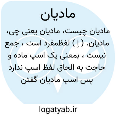 مادیان. ( اِ ) لفظمفرد است، جمع نیست، بمعنی یک اسپ ماده و حاجت به الحاق لفظ اسپ ندارد پس اسپ مادیان گفتن خطا باشد و ماده دیگر حیوان را مادیان نمی گویند. خاص ماده اسپ را گویند. ظاهر همین است که مادیان تمام یک لفظ است ومی تواند که مزید علیه ماد بود چون سالیان بمعنی سال. ( غیاث ) ( بهار عجم ) ( آنندراج ). اسب ماده که بتازی حجر گویند و نیز خر ماده. ( ناظم الاطباء ):
