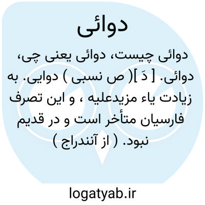 دوائی. [ دَ ]( ص نسبی ) دوایی. به زیادت یاء مزیدعلیه، و این تصرف فارسیان متأخر است و در قدیم نبود. ( از آنندراج ) ( از غیاث ). منسوب به دوا. طبی. ( ناظم الاطباء ). دارویی. منسوب و مربوط به دوا. که خاصیت دارو دارد. رجوع به دارویی شود. || معتاد به الکل. الکلی.
