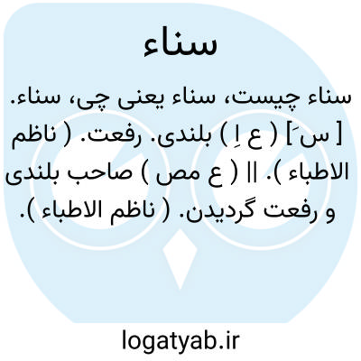 سناء. [ س َ] ( ع اِ ) بلندی. رفعت. ( ناظم الاطباء ). || ( ع مص ) صاحب بلندی و رفعت گردیدن. ( ناظم الاطباء ).