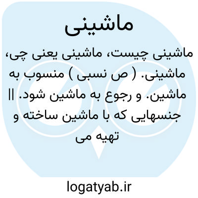 ( صفت ) منسوب به ماشین. ۱- جنسی که با ماشین ساخته و تهیه شود یا برنج ماشینی. برنجی که بوسیل. ماشین پوست آن گرفته وتمیز میشود مقابل برنج دنگی. یا نان ماشینی. نانی که بوسیل. ماشین تهیه و پخته شود. ۲- مانندماشین: ماشینی کار میکند.