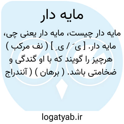 ( صفت ) ۱ آنکه دارای مایه است کسی که بضاعتی دارد: بر هر مایه دار معنی و پیرایه بند هنر که رسیدم او را بر اتمام آن مرغب و محرض یافتم. ۲- توانگر دولتمند. ۳- گنده ضخیم ستبر: ببالا در آمد به دژ بنگرید یکی مایه دار آهنین باره دید. ( شا.بخ ۴ ) ۱۶٠۷: ۶- پررنگ: چایی مایه دار. ۵- واحدی از لشکریان غیر منظم که در عقب لشکریان منظم جا میگرفتند ( غزنویان ببعد ) چند اول: و حرکت هرمنزلی بر تعبیه بود قلب و میمنه ومیسره و جناحها و مایه دار ساقه و مقدمه راست میرفتند.