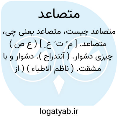 متصاعد. [ م ُ ت َ ع ِ ] ( ع ص ) چیزی دشوار. ( آنندراج ). دشوار و با مشقت. ( ناظم الاطباء ) ( از منتهی الارب ) ( از اقرب الموارد ). || بالابرآینده. ( غیاث ) ( آنندراج ). فرهنگستان ایران معادل این کلمه را «فرایاز» انتخاب کرده است. و رجوع به واژه های نو فرهنگستان ایران و تصاعد شود: همواره در مدارج علو و معارج سُمُوّ متصاعد و مترقی باد. ( سند بادنامه ص 216 ). || بلند و بالا و بالا برآمده. ( ناظم الاطباء ) ( از فرهنگ جانسون ). || بربلندی رونده. ( آنندراج ) ( غیاث ).
