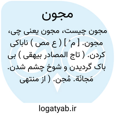 مجون. [ م ُ ] ( ع مص ) ناباکی کردن. ( تاج المصادر بیهقی ) بی باک گردیدن و شوخ چشم شدن. مَجانَة. مُجن. ( از منتهی الارب ) ( از آنندراج ). بی باکی کردن و شوخی و هزل. ( غیاث ). در قول و فعل بی پروا بودن. ( از اقرب الموارد ). بی باکی. شوخی. هزل. دعابه. ( یادداشت به خط مرحوم دهخدا ): المجون طرف من الجنون. ( یادداشت ایضاً ). || سخت و درشت گردیدن. ( از منتهی الارب ) ( آنندراج ) ( از اقرب الموارد ).