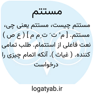 مستتم. [ م ُ ت َ ت ِم م ] ( ع ص ) نعت فاعلی از استتمام. طلب تمامی کننده. ( غیاث ). آنکه اتمام چیزی را درخواست می کند. ( ناظم الاطباء ) ( اقرب الموارد ). || پردازنده و تمام کننده. ( ناظم الاطباء ). کامل کننده اجزاء چیزی. ( اقرب الموارد ):
