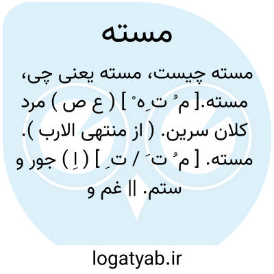مسته. [ م ُ ت َ / ت ِ ] ( اِ ) جور و ستم. || غم و اندوه. ( برهان ) ( انجمن آرا ) ( جهانگیری ). || نام دارویی است که آن را به عربی سعد گویند. ( برهان ). بیخ گیاهی است دوائی که در کنار جو و کنار رودخانه ها و تالاب بهم رسد و آن را سکک نیز نامند. ( جهانگیری ). سعده. ( الفاظ الادویه ). || چاشنی باشد چنانکه باز را و شکاریها را گوشت دهند و بدان بنوازند. ( لغت فرس اسدی ). طعمه جانوران شکاری مثل باز و شاهین و چرغ و شکره. ( از برهان ). طعمه مرغان شکاری. ( انجمن آرا ). خورش شکره. ( نسخه ای از لغت فرس ). خورش اشکره. ( صحاح الفرس ). چاشنی شکره. خورش شکره. کمی از گوشت یا مغز سرطائری به مرغ شکاری دهند تا او به شکار حریص شود. ( یادداشت مرحوم دهخدا ). چشته. چاشنی. کریز. فریه: