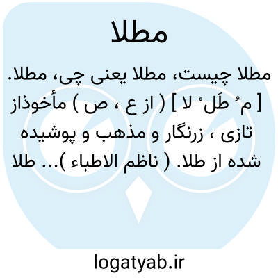 مطلا. [ م ُ طَل ْ لا ] ( از ع، ص ) مأخوذاز تازی، زرنگار و مذهب و پوشیده شده از طلا. ( ناظم الاطباء )... طلا که لفظ فارسی است آن را فارسی زبانان عربی دان به طریق صیغه عربی آورده اند، دوم آنکه طلا به معنی اندودن است چون طلا اندود نیز اندوده است آن را نیز مطلا گفته اند، از عالم اطلاق عام بر خاص و این در صورتی ثابت شود که اندودن غیر مایه را نیز در عربی طلا گفته باشند. ( از آنندراج ). مذهب. زراندود. اندوده.طلی کرده. ( یادداشت به خط مرحوم دهخدا ):