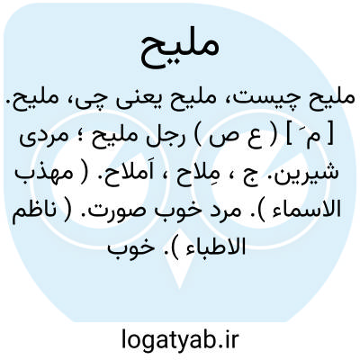 ( صفت ) ۱ - نمک دار شور. ۲ - دارای ملاحت نمکین با نمک: [ کان نمک رسید هین گر تو ملیح و عاشقی کاس ستان و کاسه ده شور گزین نه شوربا ] ( دیوان کبیر ۳ ) ۳۶: ۱ - گندمگون. ۴ - خوشگل خوب روی جمع: ملاح.
