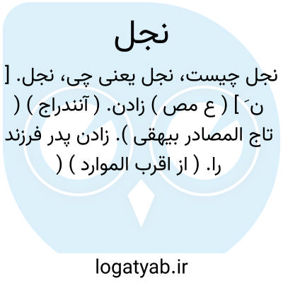 نجل. [ ن َ ] ( ع مص ) زادن. ( آنندراج ) ( تاج المصادر بیهقی ). زادن پدر فرزند را. ( از اقرب الموارد ) ( آنندراج ) ( غیاث اللغات ). انداختن. ( زوزنی ). زادن فرزند را پدر. ( از منتهی الارب ). || انداختن چیزی را. ( منتهی الارب ) ( از اقرب الموارد ). || پراندن ناقه سنگریزه را با سپل خویش. ( از اقرب الموارد ). || سخت سیر کردن. ( ناظم الاطباء ). به تندی رفتن. ( از المنجد ). سیر شدید. ( از اقرب الموارد ). || کار کردن. ( منتهی الارب ) ( آنندراج ). عمل. ( فرهنگ نظام ) ( اقرب الموارد ). || پاک کردن کودک تخته را. ( منتهی الارب ): نجل الصبی لوحَه ُ؛ محاه. ( اقرب الموارد ) ( المنجد ). || به نیزه زخم فراخ کردن. ( منتهی الارب ) ( آنندراج ). زخم فراخی با نیزه بر کسی وارد کردن. ( ناظم الاطباء ). نیزه زدن بر کسی. ( از اقرب الموارد ) ( از المنجد ). طعنه زدن، چنانکه جراحت آن فراخ باشد. ( تاج المصادر بیهقی ). || شکافتن. ( منتهی الارب ) ( آنندراج ) ( زوزنی ) ( تاج المصادر بیهقی ) ( دهار ). || شکافتن زمین را برای زراعت. ( از اقرب الموارد ) ( منتهی الارب ) ( از المنجد ). شخم زدن. || شکافتن پوست را مابین هر دو پای سپس ِ آن باز کردن. ( منتهی الارب )( آنندراج ): نجل الجلد؛ شکافت پوست را از دو عرقوب آن و سپس پوست کند. ( ناظم الاطباء ). شکافتن پوست را ازدو عرقوب آن و سپس کندن آن را از قفا. ( اقرب الموارد ) ( المنجد ). || پیش پای زدن کسی را چنانکه درغلطد. ( اقرب الموارد ) ( منتهی الارب ) ( آنندراج ) ( ازالمنجد ). || سبز شدن زمین. ( منتهی الارب ) ( آنندراج ) ( از اقرب الموارد ) ( از المنجد ). || زهاب ناک گردیدن زمین. ( منتهی الارب ) ( آنندراج ). با زه آب شدن زمین. ( تاج المصادر بیهقی ). || باکسی بدی کردن. ( منتهی الارب ) ( آنندراج ) ( از اقرب الموارد ) ( از المنجد ). || بیرون آوردن و آشکار کردن چیزی را. ( منتهی الارب ) ( آنندراج ). ظاهر کردن چیزی را. ( از اقرب الموارد ) ( از المنجد ). || ( اِ ) فرزند. زه. ( منتهی الارب ) ( اقرب الموارد ) ( المنجد ). زه و زاد. ( مهذب الاسماء ) ( السامی ) ( از نصاب الصبیان ). اولاد. ( غیاث اللغات ). فرزند. ( فرهنگ نظام ) ( ناظم الاطباء ) ( فرهنگ خطی ). || نژاد. ( ناظم الاطباء ) ( فرهنگ نظام ). نسل. ( المنجد ) ( اقرب الموارد ) ( السامی ) ( غیاث اللغات ). || پدر. ( منتهی الارب ) ( آنندراج ) ( فرهنگ نظام ) ( ناظم الاطباء ). والد. ( منتهی الارب ) ( اقرب الموارد ) ( از المنجد ). ج، انجال. || گروه بسیار. ( منتهی الارب ) ( اقرب الموارد ) ( فرهنگ نظام ) ( ناظم الاطباء ). جمع کثیر. ( اقرب الموارد ) ( المنجد ). || میانه راه. || رفتار سخت. || زهاب که از زمین و رودبار برآید. ( منتهی الارب ) ( آنندراج ) ( ناظم الاطباء ). زهاب. ( فرهنگ نظام ). زه آب که از زمین و از وادی برآید. ( از اقرب الموارد ). آب زه. ( مهذب الاسماء ). زهاب که از زمین بجوشد. ( از المنجد ). || آب بر روی زمین روان. ( از منتهی الارب ) ( آنندراج ). آب روان بر روی زمین. ( ناظم الاطباء ). آب روان. || ماء مستنقع. ( اقرب الموارد ) ( از المنجد ). آب راکد. || محجة. ( المنجد ). ج، نِجال، انجال.