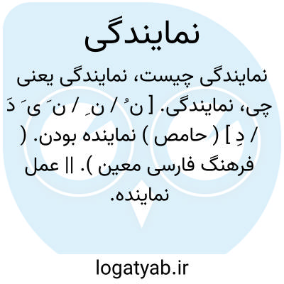 نمایندگی. [ ن ُ / ن ِ / ن َ ی َ دَ / دِ ] ( حامص ) نماینده بودن. ( فرهنگ فارسی معین ). || عمل نماینده. ( یادداشت مؤلف ):
