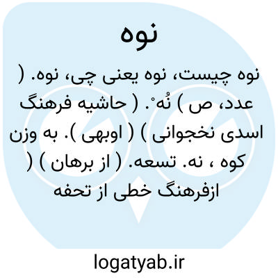 نوه. ( عدد، ص ) نُه ْ. ( حاشیه فرهنگ اسدی نخجوانی ) ( اوبهی ). به وزن کوه، نه. تسعه. ( از برهان ) ( ازفرهنگ خطی از تحفه ). رجوع به نُه ْ شود: