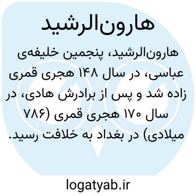 (هارون بن مهدی ملقب به اَلرّشید) پنجمین و مشهورترین خلیفۀ عباسی (حک: ۱۷۰ـ۱۹۳ق). فرزند مهدی بود و با فرمان پدر به جنگ با رومیان رفت و تا دروازه های قسطنطنیه پیش روی کرد. وی پس از مرگ برادرش، هادی، به خلافت رسید. در خلافت هارون، یحیی بن عبدالله بن حسن که در مخالفت خلیفه به سرزمین دیلم درآمده بود، امان داده شد، ولی هارون او را به زندان انداخت. به رغم قدرت و عظمت ظاهری خلافت هارون، شورش های وسیعی در ایالت های سند، شام، جزیره، افریقیه (تونس )، یمن و ارمنستان به وقوع پیوست که با نیروی نظامی یا تدبیر فرماندهان خلیفه، آن مناطق آرام گشت. وی امام موسی کاظم (ع) را توقیف کرد و پس از چند سال حبس ایشان را به شهادت رساند. در خلافت هارون، نخستین بار در قلمرو خلافت تجزیه پدید آمد و اِدْریس بن عبدالله نخستین حکومت علویان را در مراکش برپا کرد. ابراهیم بن اَغْلَب نیز به فرمان هارون فرمانروای افریقیه شد و حکومت آن منطقه در میان خاندانش تداوم یافت. هارون در ۱۷۵ق فرزندش، محمد امین، را ولایتعهد کرد و در ۱۸۳ق برای فرزند دیگرش، عبدالله مأمون، به ولایتعهدی امین بیعت گرفت و به سال ۱۸۹ق، قاسم، فرزند سوم خود، را به عنوان ولیعهد مأمون معرفی کرد. دوران خلافت هارون همراه شکوفایی در رونق قلمرو عباسیان بود. افسانه های هزارو یک شب یادآور عصر هارون است. وی در ۲۳ سال خلافت خود، یک سال به حج و سال دیگر به جنگ می رفت. هارون نخستین خلیفۀ عباسی است که چوگان بازی کرد. یحیی و جعفر بَرْمکی، از برامکه ای که تبار بزرگان ایران باستان داشتند، در زمان هارون بر همۀ دستگاه خلافت مسلط بودند، لذا هارون از آن ها سخت بیمناک شد و سرانجام در یک شب همۀ آنان را گرفت و کشت یا به زندان انداخت. هارون در ۱۹۲ق برای سرکوبی شورش خراسان رهسپار آن دیار شد و به طوس آمد و در روستای سَناباد منزل کرد ولی سخت بیمار شد و درگذشت و همان جا مدفون شد.