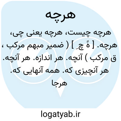 ۱- هرچیز: (( هرچه ازجنس زمین بود چون کحل وزرنیخ.. تیمم بر آهن روابیند. ) ) ۲- هراندازه هرقدر: (( وهرچه درامکان گنجد ازخرابی واضرار بتقدیم رسانیدند. ) ) ۳- هرچکه ( در ذوی العقولبکاررود ) توضیح ((هرچه ) ) گاه برسرصفت تفضیلی در آید ودال برتاکید درمعنی آن صفت است. یا هرچه باداباد. هرچه که شدنی است میشود: (( باخودش گفت هرچه باداباد. اقلا یک هم صحبت گیر آوردم. ) )یا هرچه باشد. بهرحال درهرحال: (( هرچه باشد توعلی رادختری درج عصمت گوهرپیغمبری. ) ) ( ازقول حسین علیهالسلام به زینب. ) یا هرچه بیشتر. هراندازه که ممکن است بیشتروفزونتر. یا هرچه تمامتر. هراندازه که ممکن است تمامتروکاملتر: (( وبحر متی هرچه تمامتر وبعزمی هرچه صادقتر کشتی هارابطرف حصار راندند. ) ) یاهرچه خوبتر. هراندازه کهممکن است خوبتر وبهتر: (( برسرصورت پرندسرشت بخطی هرچه خوبتربنوشت. ) ) ( هفت پیکر ) یا هرچه زودتر. هراندازه که ممکن است زودتر. هراندازه که ممکن است زودتر. یاهرچهصادقتر. ۱- راست گوتر. ۲- راست تر درست تر. یا هرچهظاهرتر. هرقدر که ممکن است آشکارتر: (( ومعلوم گردد که این الفاظ به یکدیگر هرچه متناسبتر است وهرکلمتی را اعجازی هرچه ظاهرتر. ) ) یاهرچهکمتر. هراندازه که ممکن است کمتر. یاهرچه متناسبتر. هرقدر که ممکن است متناسبتر یا هرچه موجزتر. هرقدرکه ممکن است مختصرتر: (( ویک باب که برذکر برزوی. طبیب مقصوداست وبه بزرجمهر منسوب هرچه موجزتر پرداختهشد... ) ) یاهرچه بدتر. (اسم ) مقعد ماتحت