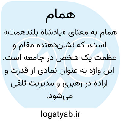 معنی: سرور، مهتر، پادشاه بلندهمت، مرد بزرگ و دلیر و بخشنده، شیر درنده، دارای مقام و منزلت و فضایل ارجمند، پادشاه بزرگ همت، مهتر دلیر و جوانمرد، سرور بزرگوار، ( اَعلام ) همام تبریزی [قرن و هجری] شاعر ایرانی، از سخنگویان نامدار آذربایجان که در غزل سرایی استاد بود، ( در اعلام ) همام تبریزی از شعرا و سخنگویان نامدار آذربایجان ( قرن هشتم هـ ق ) که در غزل سرایی استاد بود، دارای مقام و منزلت و فضایل، ارجمند، نام یکی از شعرا و سخنگویان مشهور در آذربایجان