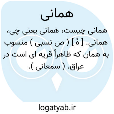 همانی. [ هََ ] ( ص نسبی ) منسوب به همان که ظاهراً قریه ای است در عراق. ( سمعانی ).