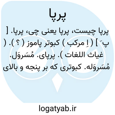 پرپا. [ پ َ ] ( اِ مرکب ) کبوتر پاموز ( ؟ ). ( غیاث اللغات ). پرپای. مُسَروَل. مُسَروَله. کبوتری که بر پنجه و بالای آن پر بسیار دارد. کبوتر پرپا، حمامه مُسَروَله. ورشان. و رجوع به پرپای شود.