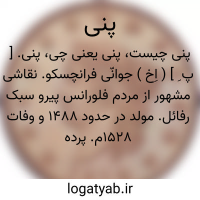 پنی. [ پ ِ ] ( اِخ ) جوانّی فرانچسکو. نقاشی مشهور از مردم فلورانس پیرو سبک رفائل. مولد در حدود 1488 و وفات 1528م. پرده های چندی از آثار او بجا مانده و شباهت تام به آثار استاد وی دارد، چندانکه تشخیص آنها باکارهای استاد حتی برای متخصصین فن بسیار صعب است.