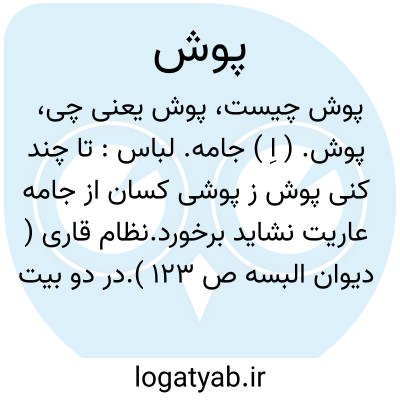 بزیر اژدهائی، پلنگینه پوش.اسدی ( گرشاسبنامه ).رجوع به پوش کردن شود. || چادر. خیمه. خرگاه. سراپرده: پوش سلطنتی؛ چادر سلطنتی. || ( نف مرخم، ن مف مرخم ) در کلمات مرکب ذیل گاه بمعنی پوشنده و گاه بمعنی پوشیده آمده است: آهن پوش. ازرق پوش. بالاپوش. برپوش. پاپوش. پرده پوش. پرنیان پوش. ( عماد ). پشمینه پوش. پلنگینه پوش. پولادپوش. تخته پوش. تن پوش. تیرپوش. حصیرپوش. جرم پوش. خرقه پوش. خزپوش. خس پوش. خطاپوش. ( حافظ ). خفتان پوش. خوش پوش. دراعه پوش. درع پوش. دلق پوش. رازپوش ( ستار ). روپوش. روی پوش. زبرپوش. زره پوش. زردپوش. زیرپوش. زین پوش. ژنده پوش. ساغری پوش. سایه پوش ( ظله ). سبزپوش. سرپوش. سِرّپوش. سرخ پوش. سفال پوش. سفیدپوش. سنجاب پوش.سیاه پوش. سینه پوش. سیه پوش ( فردوسی ). شالی پوش. شب پوش. شیک پوش. طاقچه پوش. عیب پوش. قباپوش. قوری پوش. کالی پوش. کجاوه پوش. کفل پوش ( در اسپ ). کفن پوش. کهنه پوش. لاله پوش ( فردوسی ). لعل پوش. مجمعه پوش. مجموعه پوش. مخمل پوش. نی پوش. یال پوش.