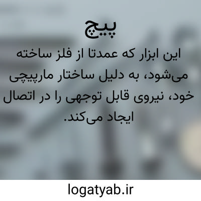 ( اسم ) ۱- خمیدگی کجی گردش گشت: امیر المومنین علی مردی را دید سر در پیش افکندهیعنی که پارسا امگفت:ای جوانمرد. این پیچ که در گردن داری در دل آر... ۲- هریک از خمهای چیزی ( مانند زلف پیشانی و غیره ) شکن ماز: شش چیز در آن زلف تو دارد معدن پیچ و گره و بند و خم و تاب و شکن. ( قابوس وشمگیر ) ۳- ( اسم ) میخ باشکال گوناگون که بر دیوار. آن فرو رفتگی و بر آمدگی از بالا یا از نیمه تا پایین بگردد مقابل مهره. ۴- رزه ای که ته آن پیچ دارد. ۵- کلید مانندی بر یک سوی سر پیچ لامپا که در میان چرخی کوچک و با دندانه دارد و از درون سر پیچ بگذارد: و با گرداندن آن دندانه های چرخ به فتیله در آویزد و بر اثر گرداندن فتیله را پایین و بالا آورد. ۶- نوعی قفل که خود انواع دارد مقابل پره دار. ۷- آلتی نوک تیز و پیچان که بدان چوب پنب. سر بطری را بیرون کشند. ۸- قسمی بخاری آهنین یا چدنی ( و غیره ). ۹- قسمی دوختن. ۱٠- ( اسم ) در بعضی کلمات مرکب بجای پیچنده آید پای پیچ مچ پیچ. ۱۱- ( اسم ) در بعضی کلمات مرکب بجای پیچیده آید:رختخواب.پیچ سوال پیچ کاغذ پیچ گوش پیچ. یا پیچ خیابان جاده و غیره. آنجا که خیابانجاده و غیره از خط مستقیم منحرف شود و بطرف دیگر ( بصورت زاوی. حاده یا قریب بقائمه ) روی نهد خم جاده. یا مثنوی پیچ. نوعی آهنگ موسیقی که بهنگام خواندن اشعار مثنوی آنرا بکار برند. ۱۲- کتوس. ۱۳- تاجریزی سرخ. ۱۴- پیچش. ۱۵- نام نوعی از گلها و گیاهان پیچنده برخی گلهای که ساق محکم ندارند و بر درخت یا دیوار بالا روند و آن شامل اقسام ذیل است: یا پیچ امین الدوله. ( اسم ) گیاهی از تیر. بداغ ها که بصورت درختچه ای بالا رونده و پیچنده است.این گیاه مخصوص نواحی معتدل است و گونه های زیاد دارد و هم. آنها دارای گلهای معطر میباشند. غالبا گلهایش سفید و گاهی زرد است و در بهار گل میکند. گیاه مزبور را باغبان بهر طریقی قیچی کند بهمان وضع درمی آید. در نقاط آفتاب رو بهتر عمل می آید و تکثیرش بوسیل. قلمه یا خوابانیدن و یا تخم انجام میشود. برگهایش مرکب شانه یی وشاخه های جوانش شکننده است پیچ باغی شونگ شجره الطحال زهرالعسل پلا خور شن سفیدال اوچ قد دقزدون دقز دانه ام الشعرائ سلطان الجبلماطر شلبهخامانخانم الی خانم پار ماغیبریقلیمنونسلطان الغابه صریمه الجدیپیانی خانم الی.یا پیچ اناری. ( اسم ) گیاهی از تیر. یاسمن شیپوری که بصورت درخت یا درختچه میباشد. برگهایش مرکب شانه یی و مخصوص نواحی گرم است. گلهایش قرمز یاسفید و چوبش معطر است و در منبت کاری بکار میرود تکومه تکوم. یا پیچ بادنجانی. تاجریزی سرخ.یا پیچ باغی.پیچ امین الدوله. یا پیچ تلگرافی. نوعی پیچ پروانش. یا پیچ حصیری.گیاهی از تیر. مار چوبه ها که جزو نباتات زمینی است.اصل این گیاه از آمریکای شمالی است. گیاهی است پایا با برگهای کوچک و بیضوی و ساقه هایش یک تا دو متر درازی پیدا میکند. این ساقه ها بدور دار بست گلدان میپیچند و گلهایش بشکل چترهای کوچکی در انتهای ساقه مجمتع شده اند. یا پیچ درختی. یا پیچ ساعتی. گل ساعتی. یا پیچ شبدر. سس