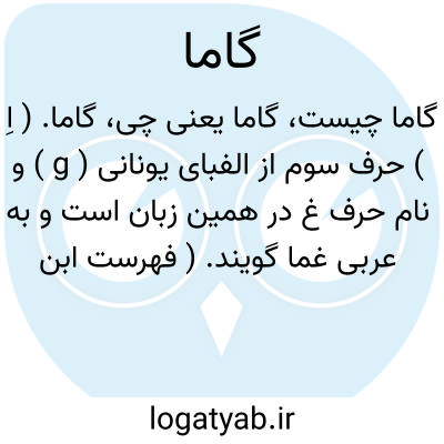 گاما. ( اِ ) حرف سوم از الفبای یونانی ( g ) و نام حرف غ در همین زبان است و به عربی غما گویند. ( فهرست ابن الندیم ص 24 ). || نام حرف سیم از حروف فلکی است و آن علامت ستاره قدر سیم صور فلکی است و صورت آن این است:gگاماگاما. ( اِ ) از مقادیر ایران قدیم،معادل 32 سانتیمتر امروز. ( ایران باستان ص 1498 ).